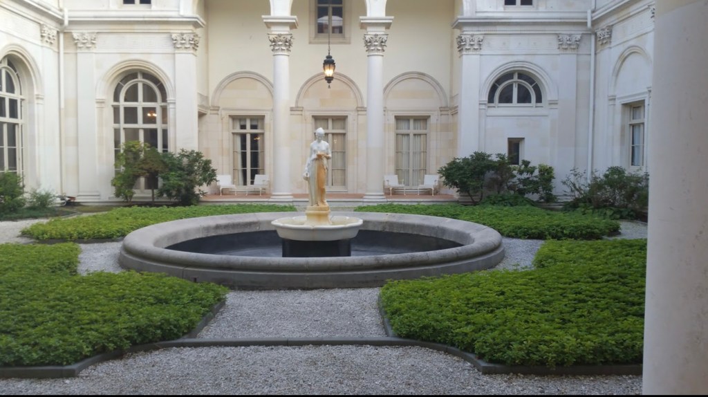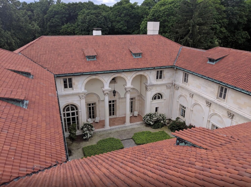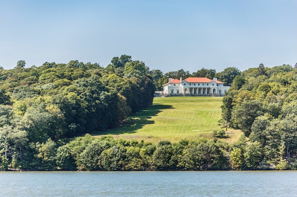 This is the Omega estate (AKA the Payne Estate) on the west bank of the Hudson River near Esopus, New York. The Beaux Arts style house was designed by Thomas Hastings of the New York architecture firm, Carrere & Hastings. The 42,000 square foot house was completed in 1911 and is sited on a 60 acre estate. The estate that eventually became Omega had three previous owners including John Jacob Astor III of the prominent Astor family and Omega was built on the site of an earlier house named Waldorf. Omega was the creation of Standard Oil executive Oliver Hazard Payne (1839-1917).