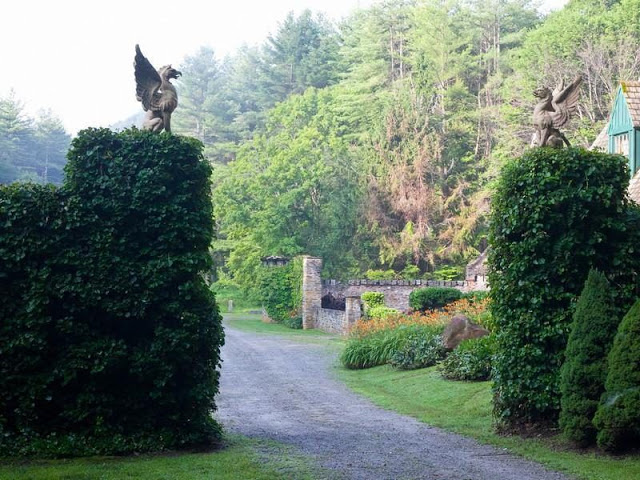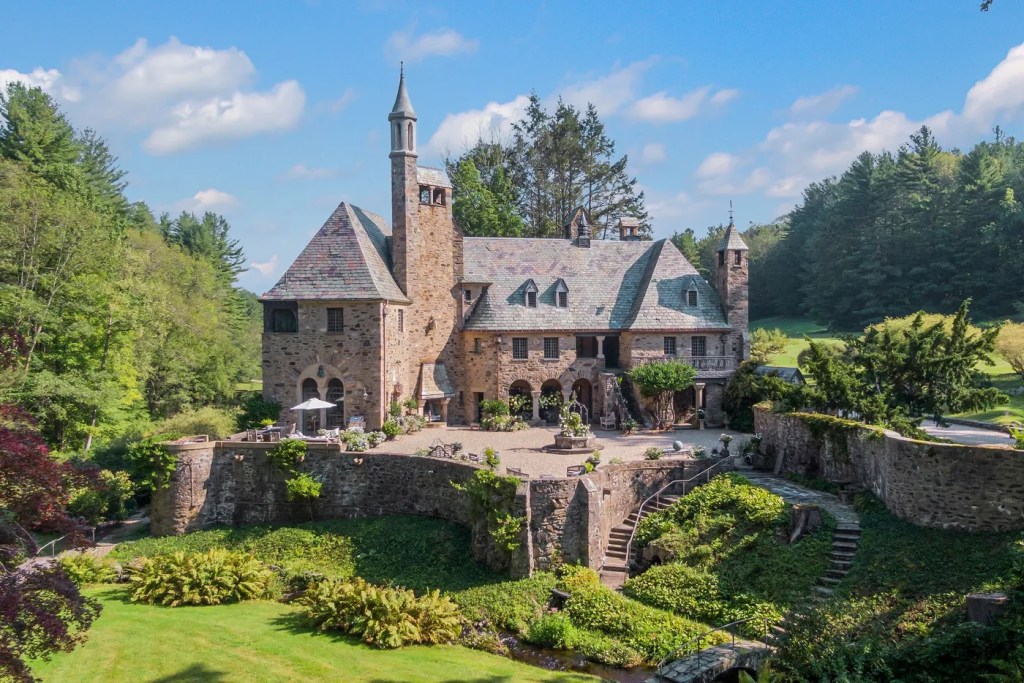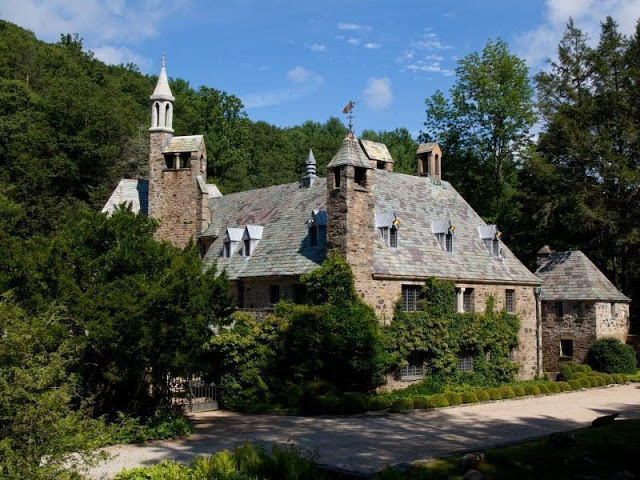 One of the rare exceptions is a home known as Cornwall Castle located near Cornwall, Connecticut in the Litchfield Hills (AKA Hidden Valley Castle).  The castle was designed by the architect, Edward Dean, and completed in 1925 for wealthy New York socialite Charlotte Bronson Hunnewell Martin and her husband, Dr. Walton Martin, a surgeon. The castle sits on 275 acres of woodland and streams and includes several outbuildings.  Charlotte came from old Massachusetts railroading and banking money and loved the concept of European nobility so much that she and the doctor built the house in a storybook castle style.  The doctor completed the illusion by occasionally riding around the estate on a white horse wearing a red cape.  In addition to the castle, Charlotte also developed a set of row houses with a shared garden in Manhattan known as Turtle Bay Gardens. Residents of Turtle Bay have included Katherine Hepburn, composer Stephen Sondheim, famous twin Mary-Kate Olsen and the author of Charlotte’s Web, E.B. White, who allegedly named the spider after his landlord. Dr. Martin passed away in 1949 and Charlotte in 1961. Charlotte cut her only child out the will and the castle was subsequently sold.